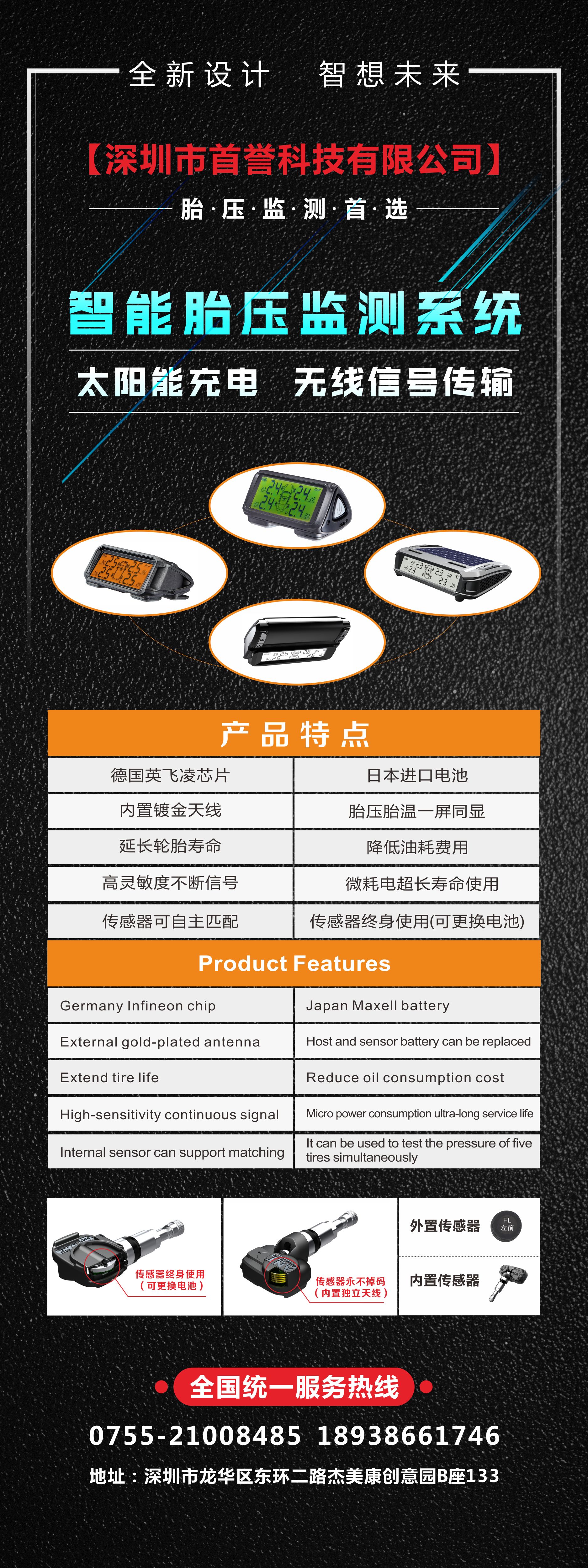 深圳市首譽科技有限公司(www.66974.cc)太陽能胎壓監測是在傳統胎壓監測裝置(無線胎壓監測器)上的一次里程碑式的更新,由太陽能顯示屏、4個壓力傳感器及溫度傳感器組成。